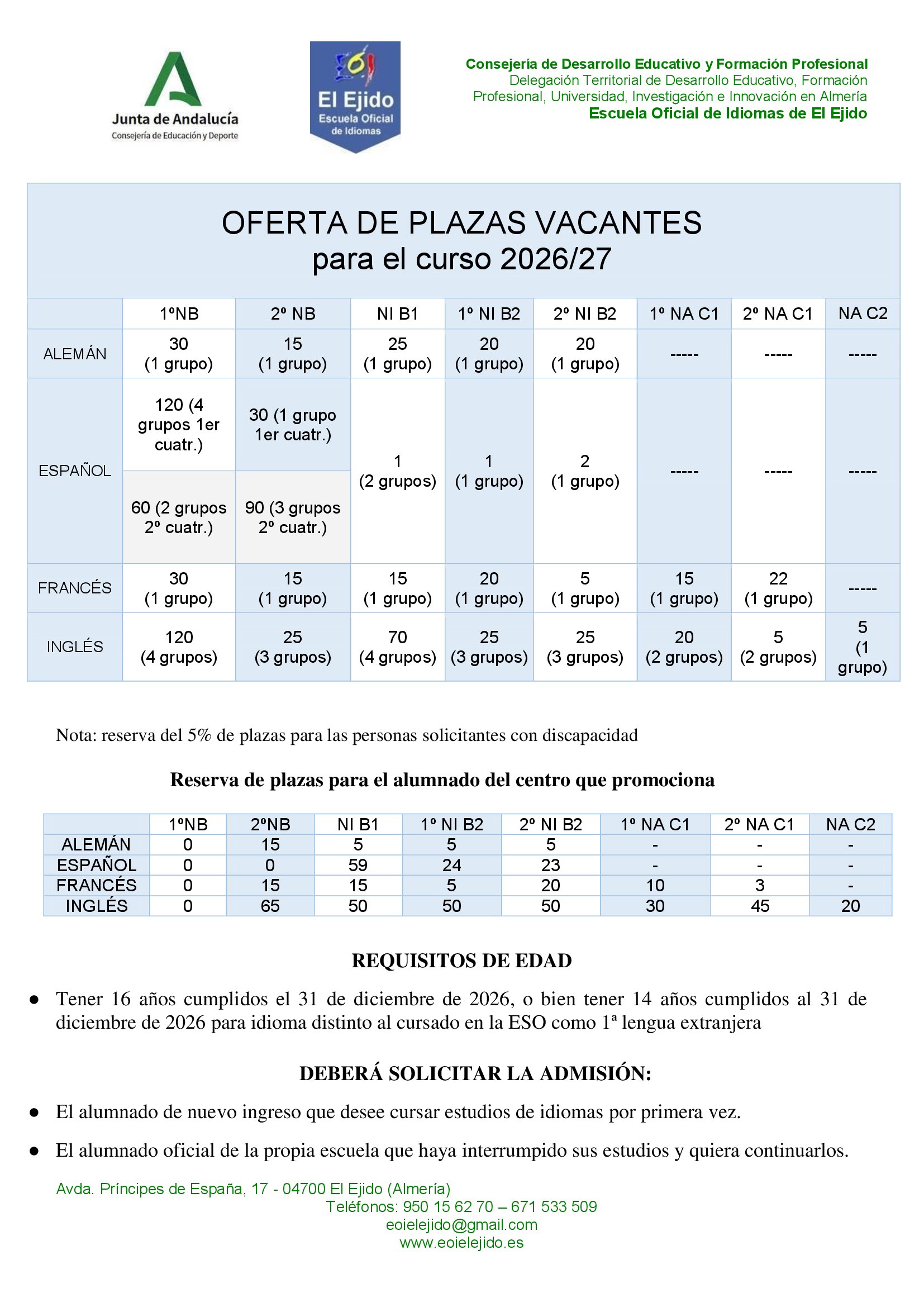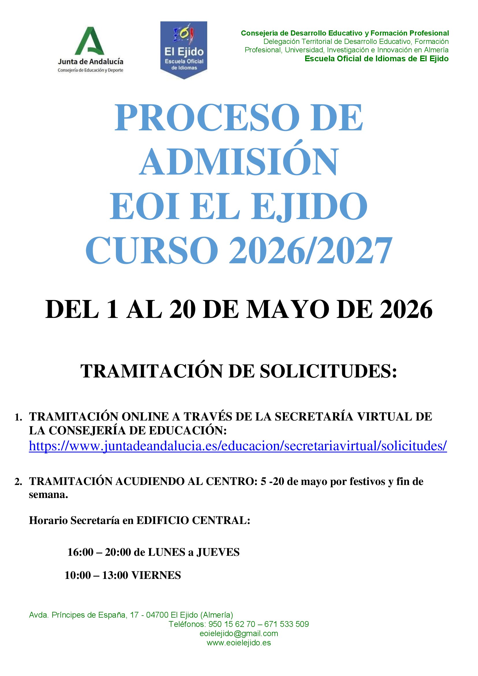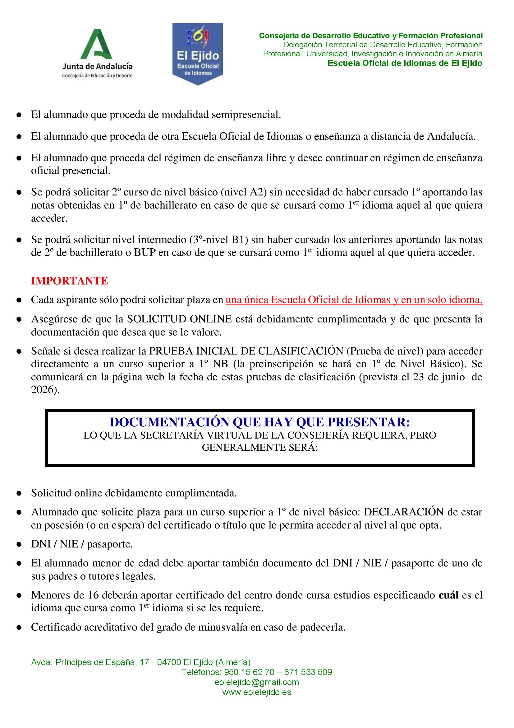 La Escuela Oficial de Idiomas de El Ejido es un centro público educativo dependiente de la Consejería de Educación de la Junta de Andalucía, que imparte enseñanza especializada de idiomas con reconocimiento oficial en toda España. Ofertamos los siguientes idiomas y niveles: