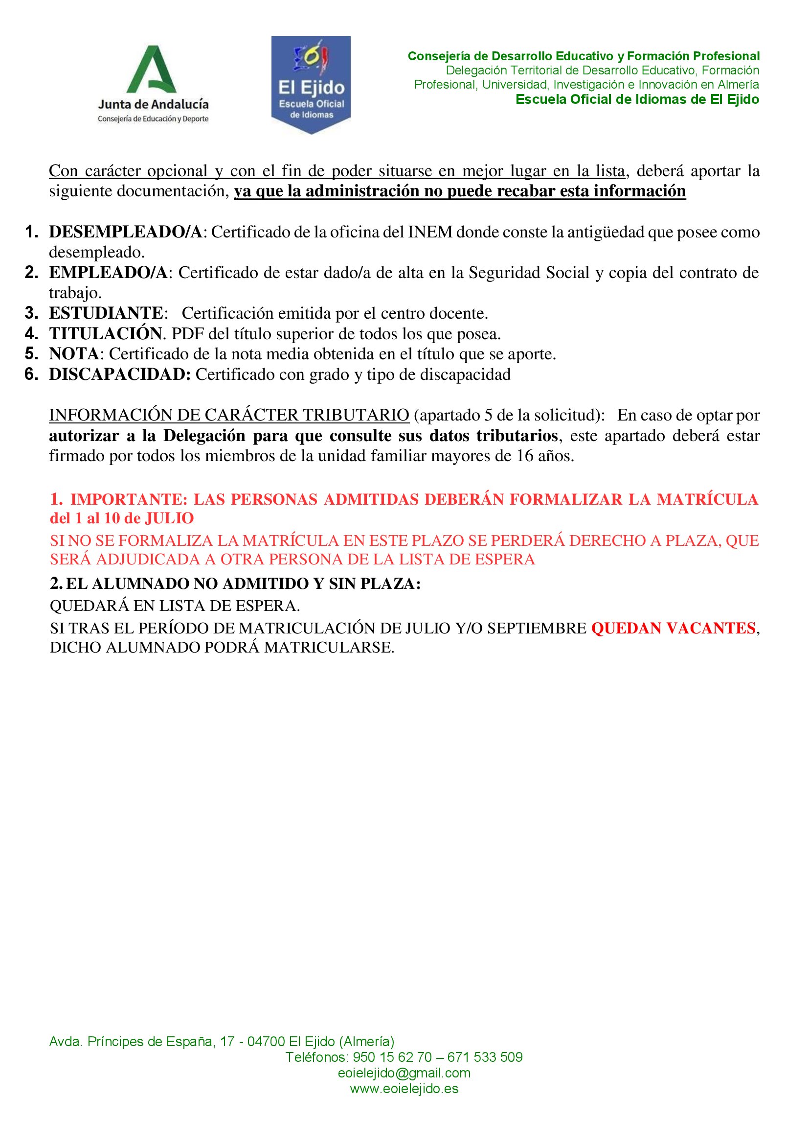 Si hubiera problemas de forma virtual, se puede hacer firmando el impreso y entregándolo en el centro dentro del plazo mencionado. Recuerde que para inscribirse físicamente en el centro, el último día es el 16 de abril.